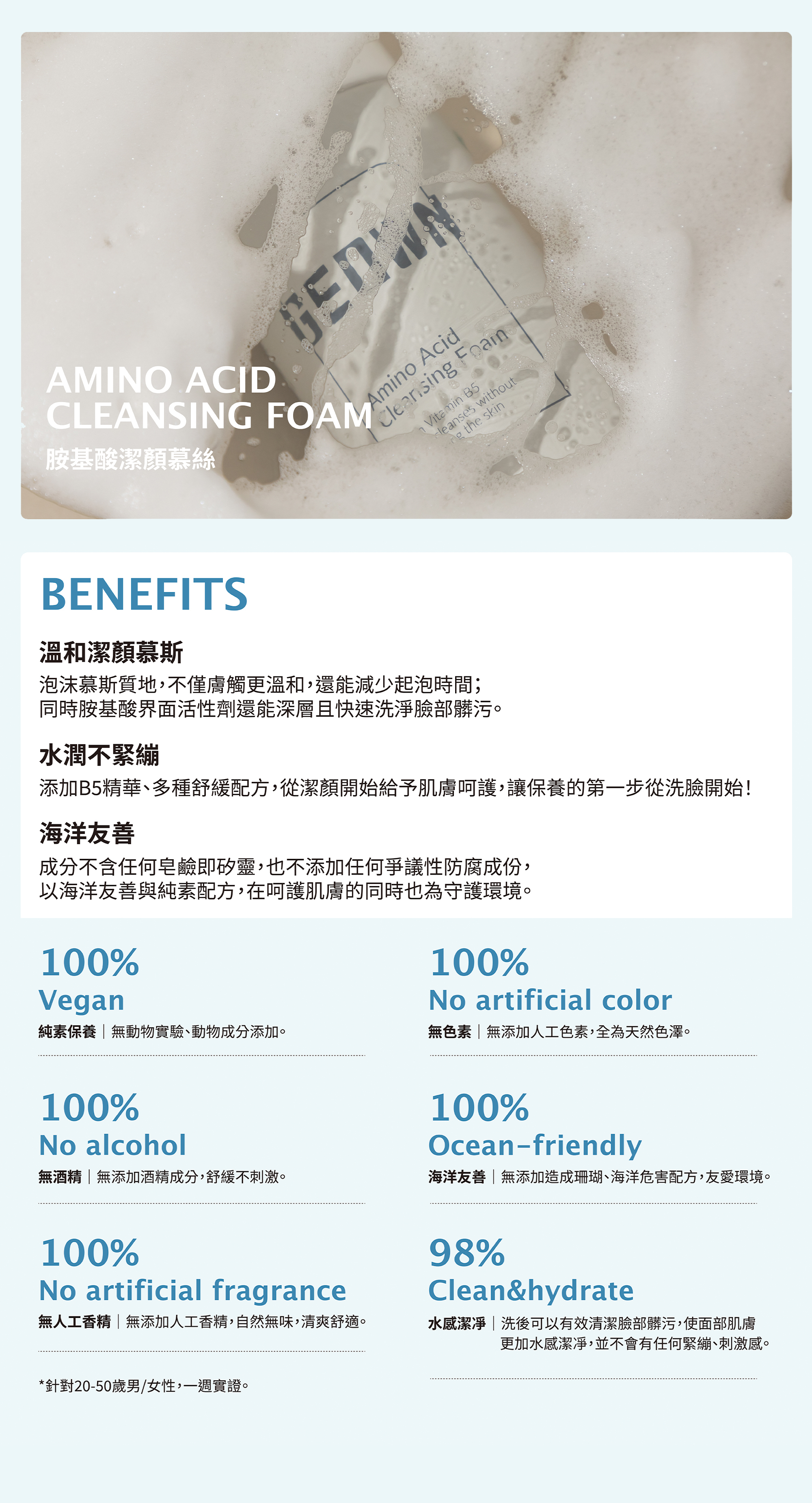使用胺基酸界面活性劑來深層洗淨臉上污垢,溫和配方讓肌膚洗後不緊繃、不乾澀;幫助保濕。